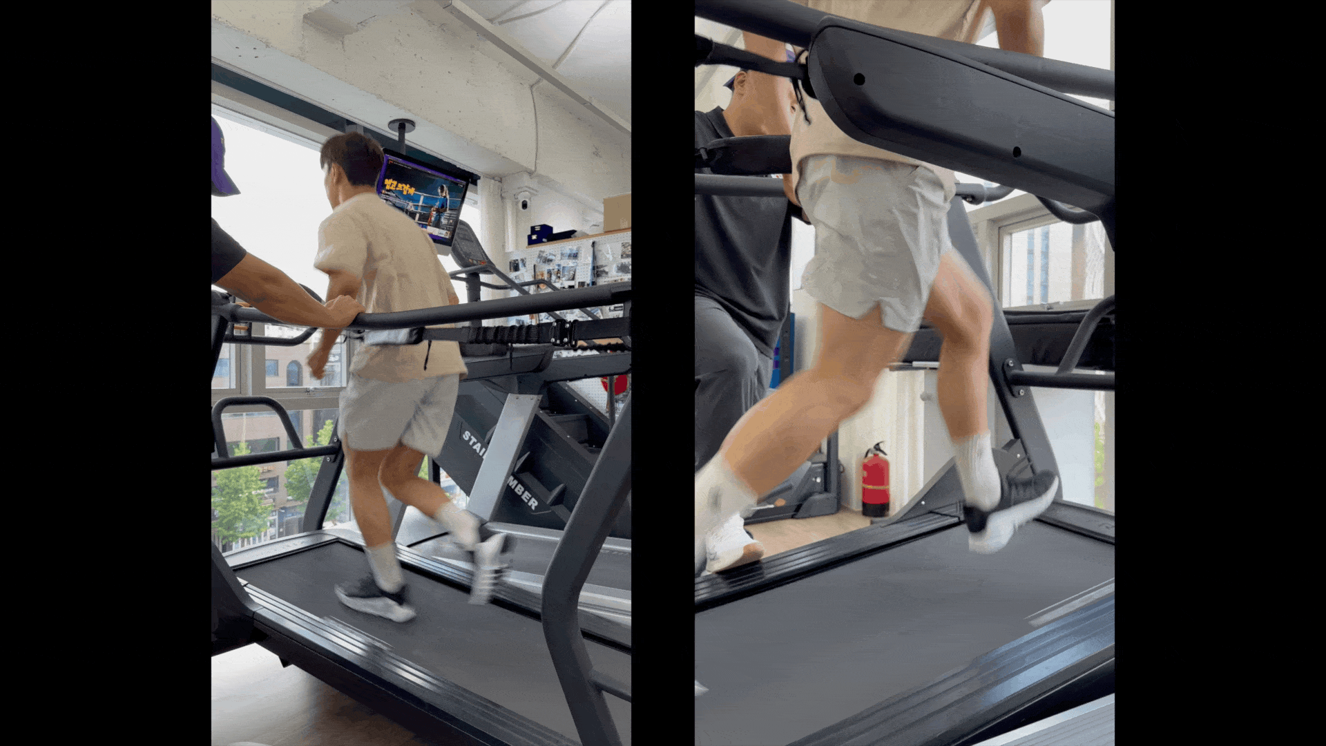 무동력 트레드밀에서의 스프린트는 선수 본인의 추진력으로 벨트를 구동시키는 훈련입니다.